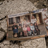 A l'étage, toujours des salles de classes. Il reste encore le noms de certains élèves sur les murs, là où ils devaient y accrocher leurs petites vestes. Au sol, des dizaines de livres d'histoire, et même une vieille photo de classe et un livret d'évaluations.